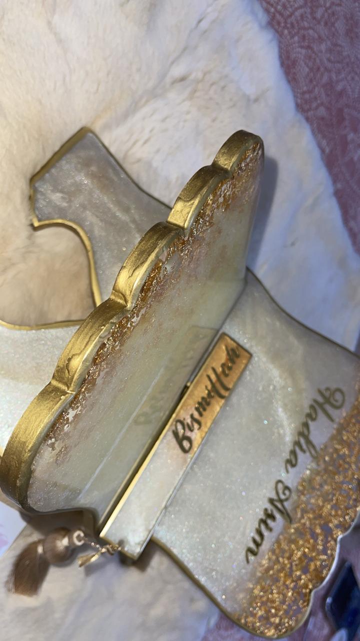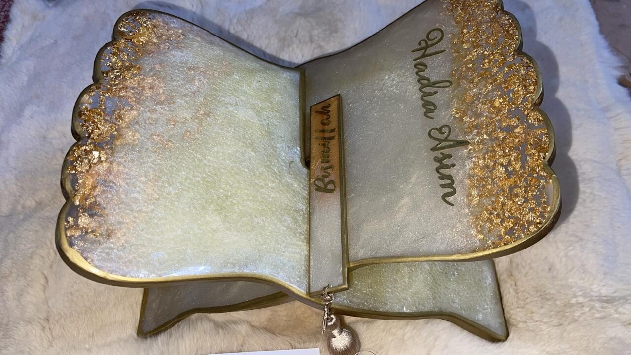 Enhance your reading experience with this beautiful, handcrafted rehal and bookmark set. Made from high-quality resin, this piece features a serene white and gold design with shimmering gold flakes, adding a luxurious and artistic touch to any space.