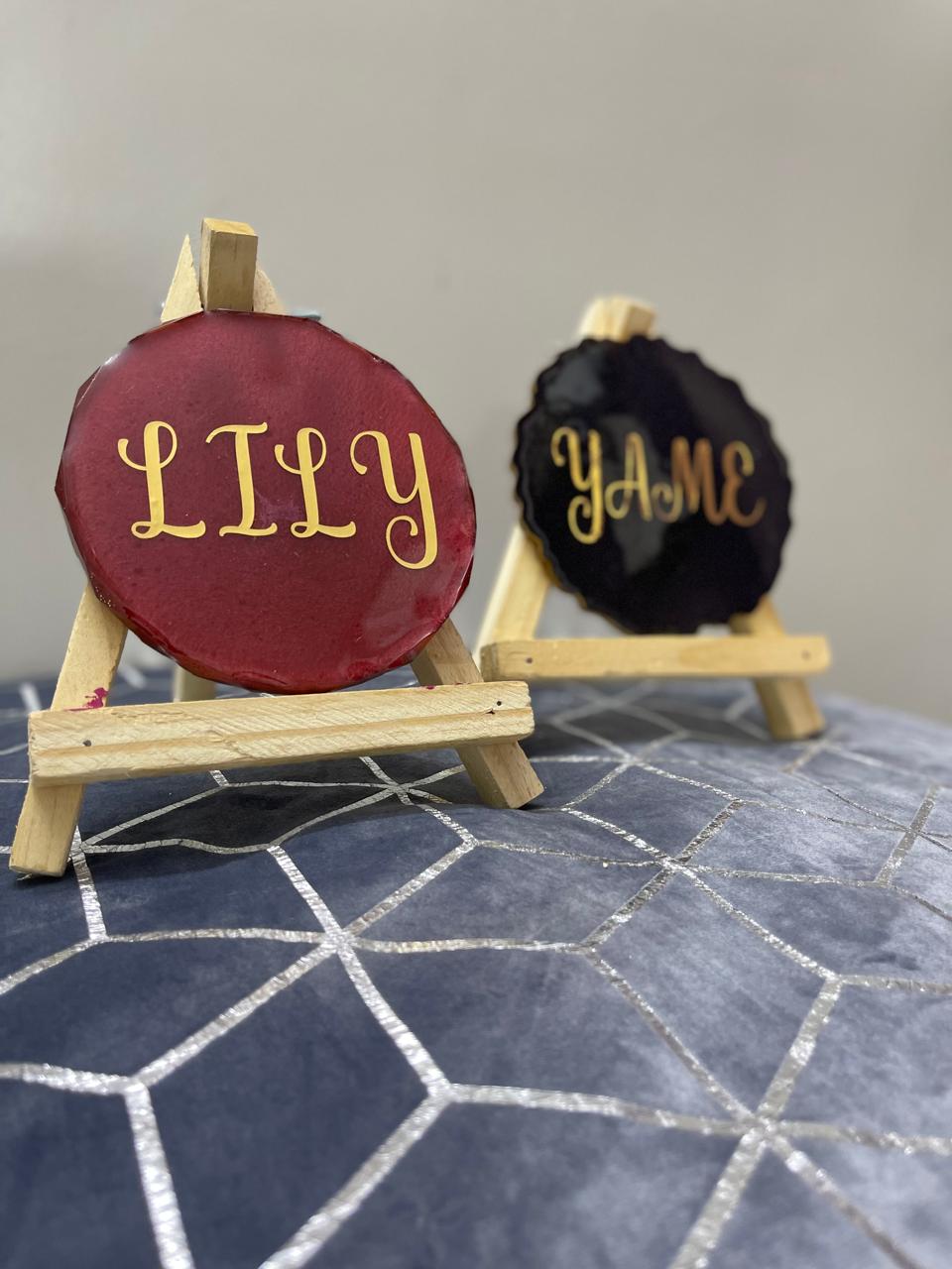 These elegant, handmade resin coasters with stands are perfect for adding a personalized touch to any space. Each piece can be customized with a name, making it a thoughtful gift or a unique decor item for your home or office. The coasters come in a glossy finish and are supported by a small wooden easel, ideal for display.
