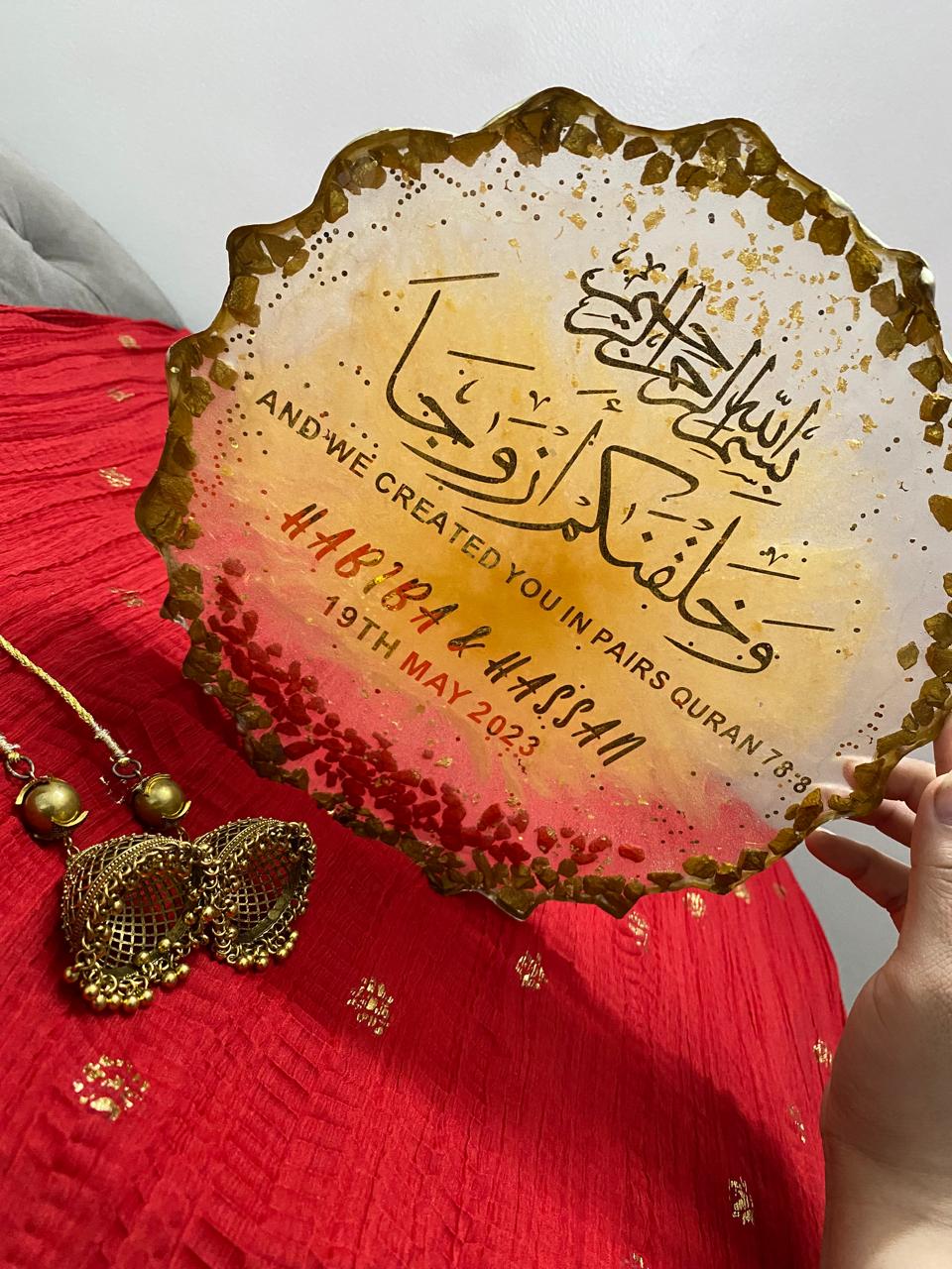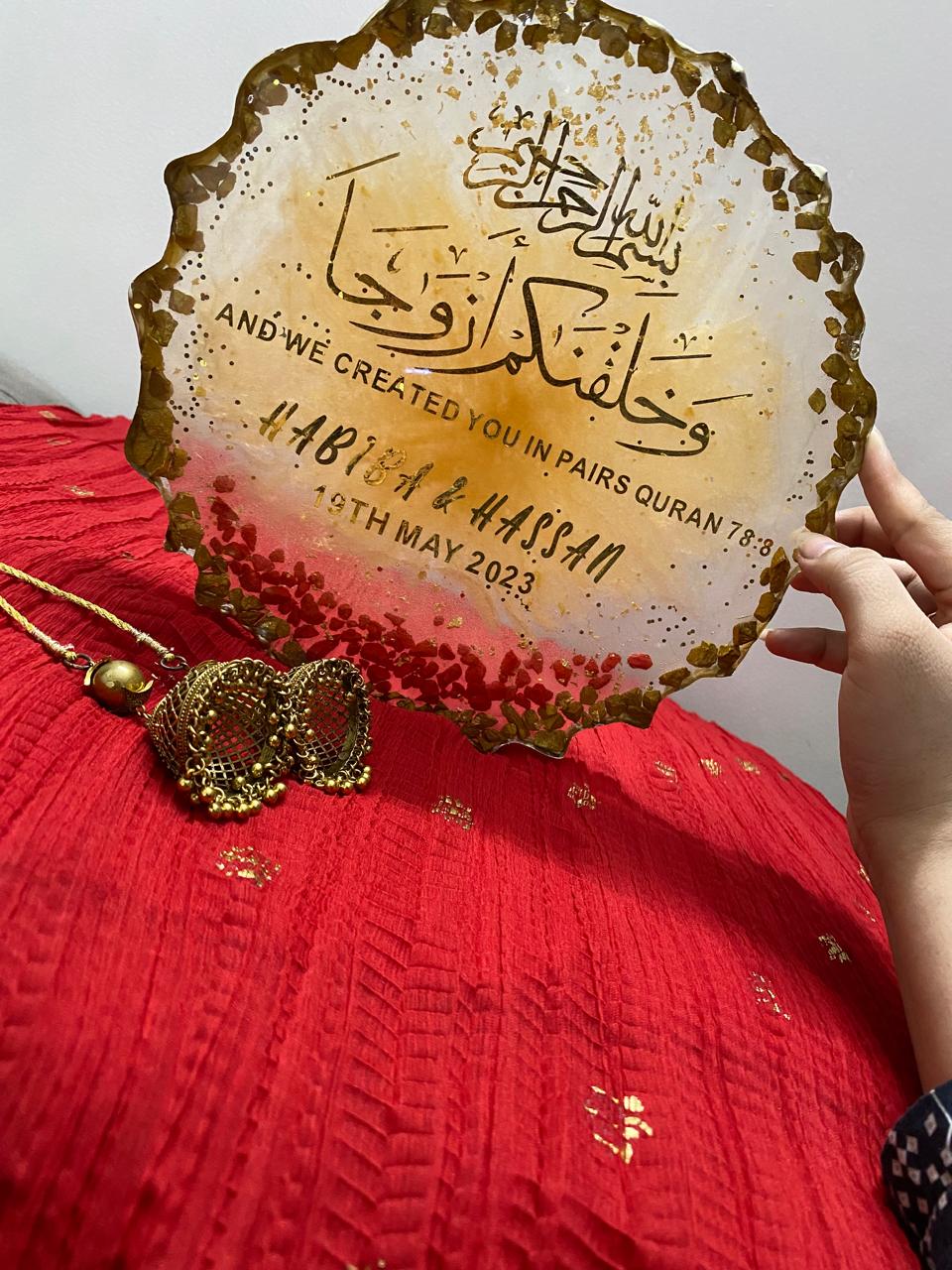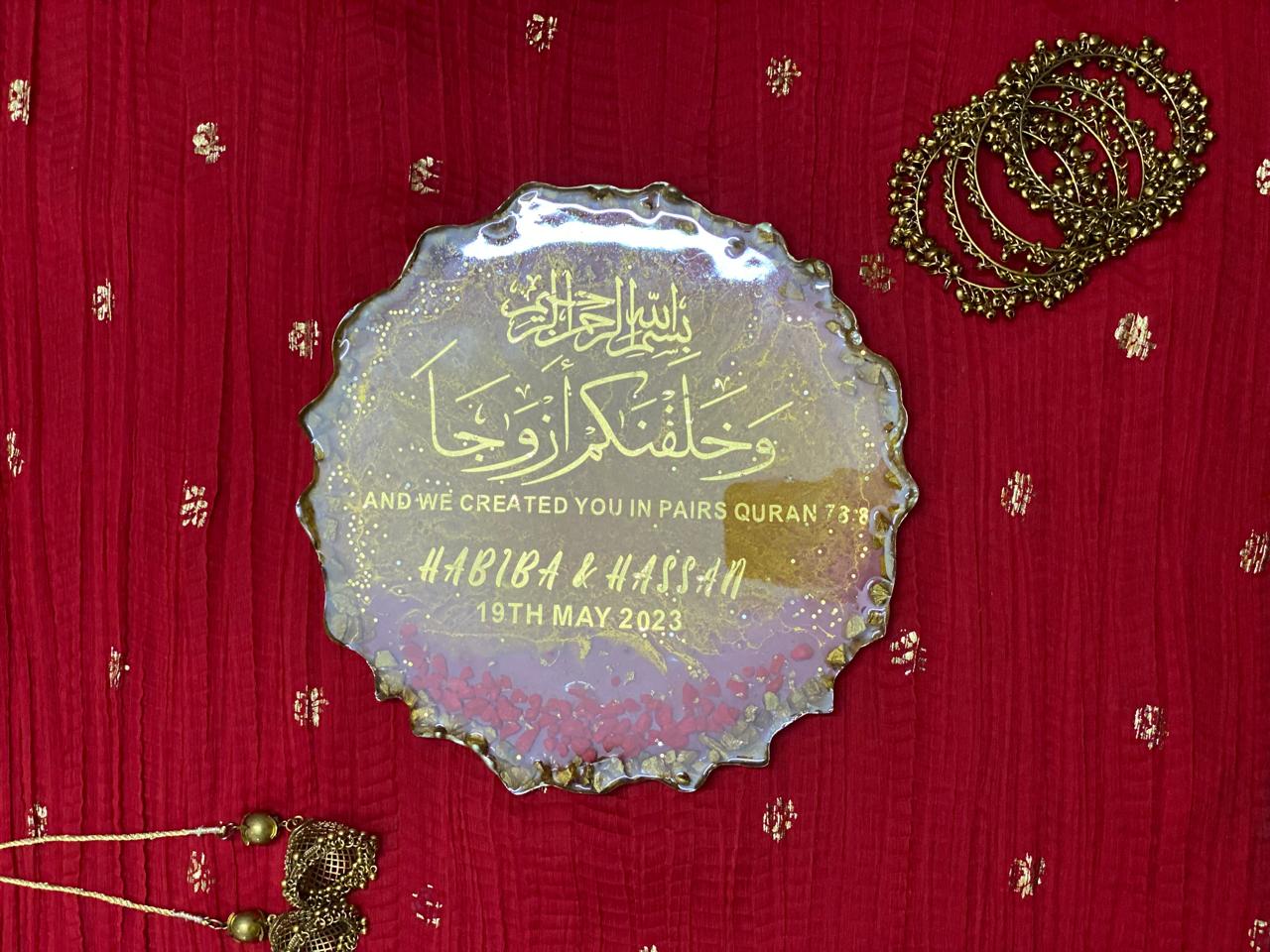 This beautiful, handcrafted resin plaque is a perfect wedding or anniversary gift, celebrating a union with a touch of faith and elegance. The plaque features the Quranic verse from Surah An-Naba, 78:8, which translates to “And We created you in pairs.” It is personalized with the couple’s names and wedding date, making it a truly unique and meaningful keepsake. The design includes gold leaf accents and a beautiful glossy finish, adding a luxurious feel.