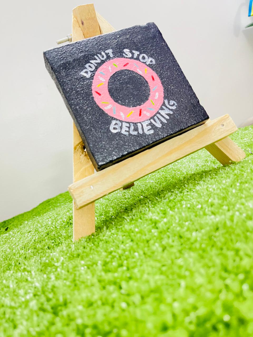 This is a quirky and motivational hand-painted canvas that combines a sweet treat with a powerful message. The playful phrase “DONUT STOP BELIEVING” is a clever and fun spin on the classic motivational quote, making it a perfect piece of desk art or decor for any space. It comes with a mini wooden easel, so you can easily display it on your desk, a bookshelf, or in your kitchen for a daily dose of encouragement. It makes a delightful and unique gift for anyone who loves puns, donuts, and a positive mindset.