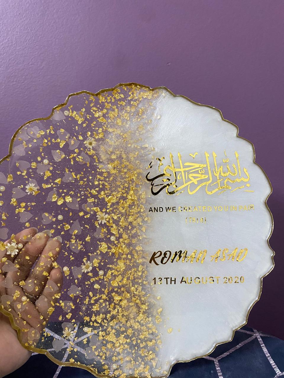 This elegant, handcrafted Islamic Resin Plaque is the perfect gift for any special occasion. It features a beautiful two-tone design with pristine white and clear resin, sprinkled with shimmering gold flakes and delicate pearls. The centerpiece is the sacred phrase “Bismillah” and the powerful Quranic verse “AND WE CREATED YOU IN PAIRS”.