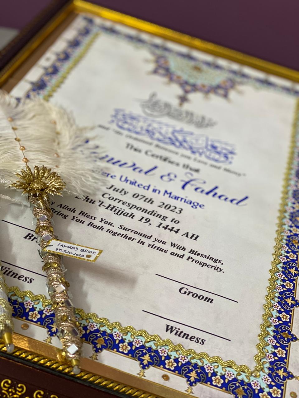 Cherish your special day forever with this exquisite Nikah Certificate Frame and Pen Set.