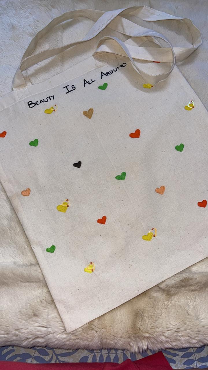 Carry love and positivity everywhere with this handmade canvas tote bag, featuring a charming “Beauty Is All Around” quote and colorful hand-painted hearts. Made with durable eco-friendly fabric, this tote is perfect for daily use – whether for shopping, college, office, or casual outings. Lightweight, reusable, and stylish, it’s a must-have accessory for eco-conscious fashion lovers.