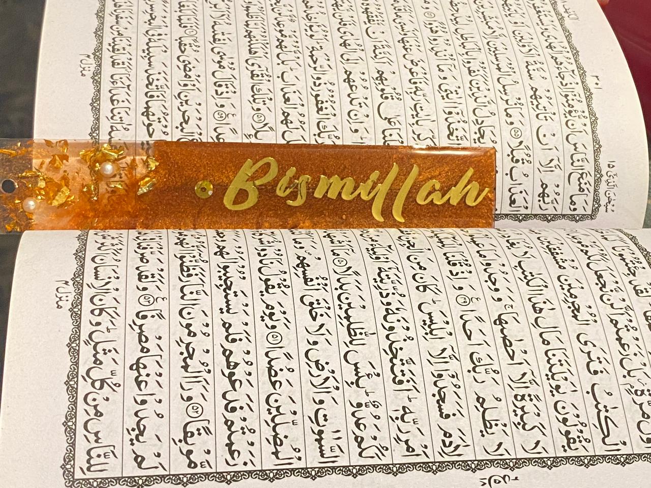 It features a unique, milky-brown resin base embedded with shimmering gold flakes and delicate pearl-like beads. The word ‘Bismillah’ (In the name of Allah) is written in elegant gold calligraphy, serving as a powerful and beautiful start to every page you turn.