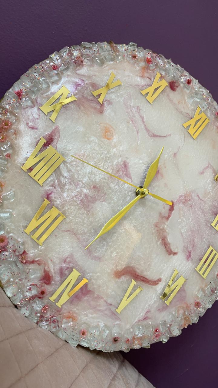 Add charm and elegance to your interiors with this handmade white and pink resin wall clock, featuring golden Roman numerals and a sparkling crystal resin border. The soft pink accents blend beautifully with the glossy white background, making it a luxury decorative wall clock as well as a functional timepiece. Perfect for living rooms, bedrooms, stylish offices, or as a premium gift for loved ones.