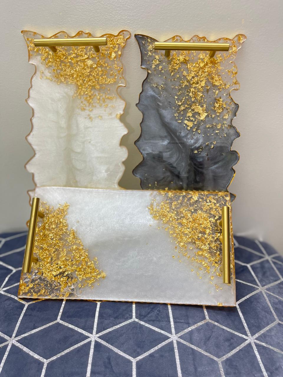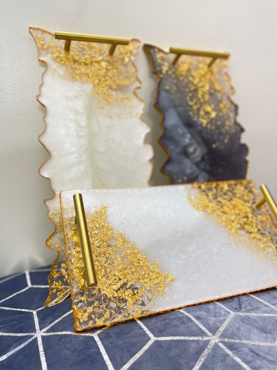 Elevate your space with this stunning Set of 2 Handmade Resin Trays. This unique set includes both a luxurious black and gold tray and a sophisticated white and gold tray, each one-of-a-kind. The trays are finished with shimmering gold flakes and elegant gold handles, combining functionality with high-end style.