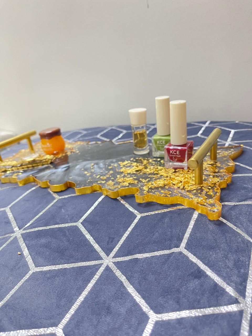 Elevate your space with this stunning, handcrafted Black and Gold Resin Vanity Tray. This unique tray features a luxurious blend of deep black and gray with shimmering gold flakes, making each piece one of a kind. The elegant gold handles add a touch of sophistication, perfect for both style and function.